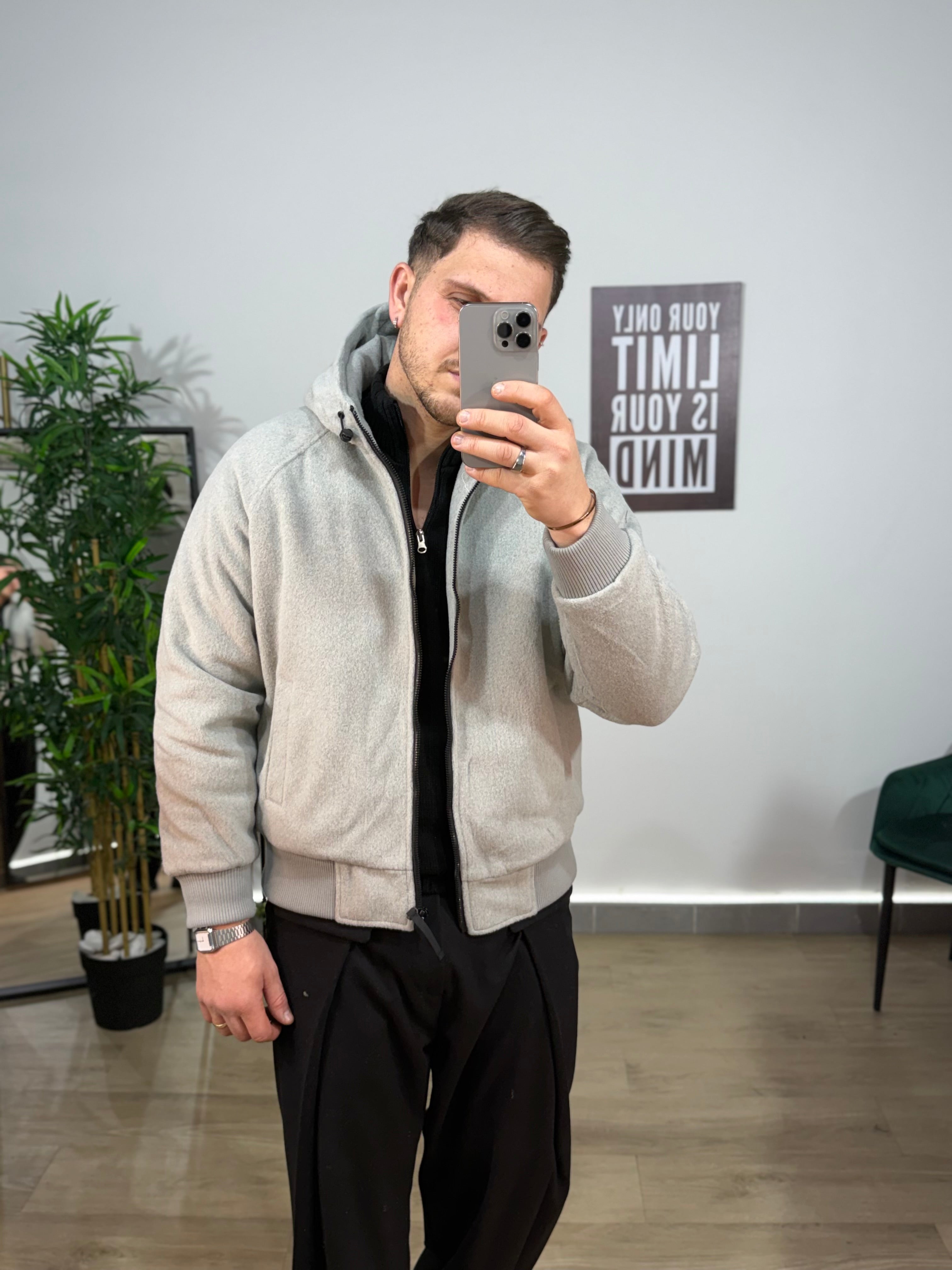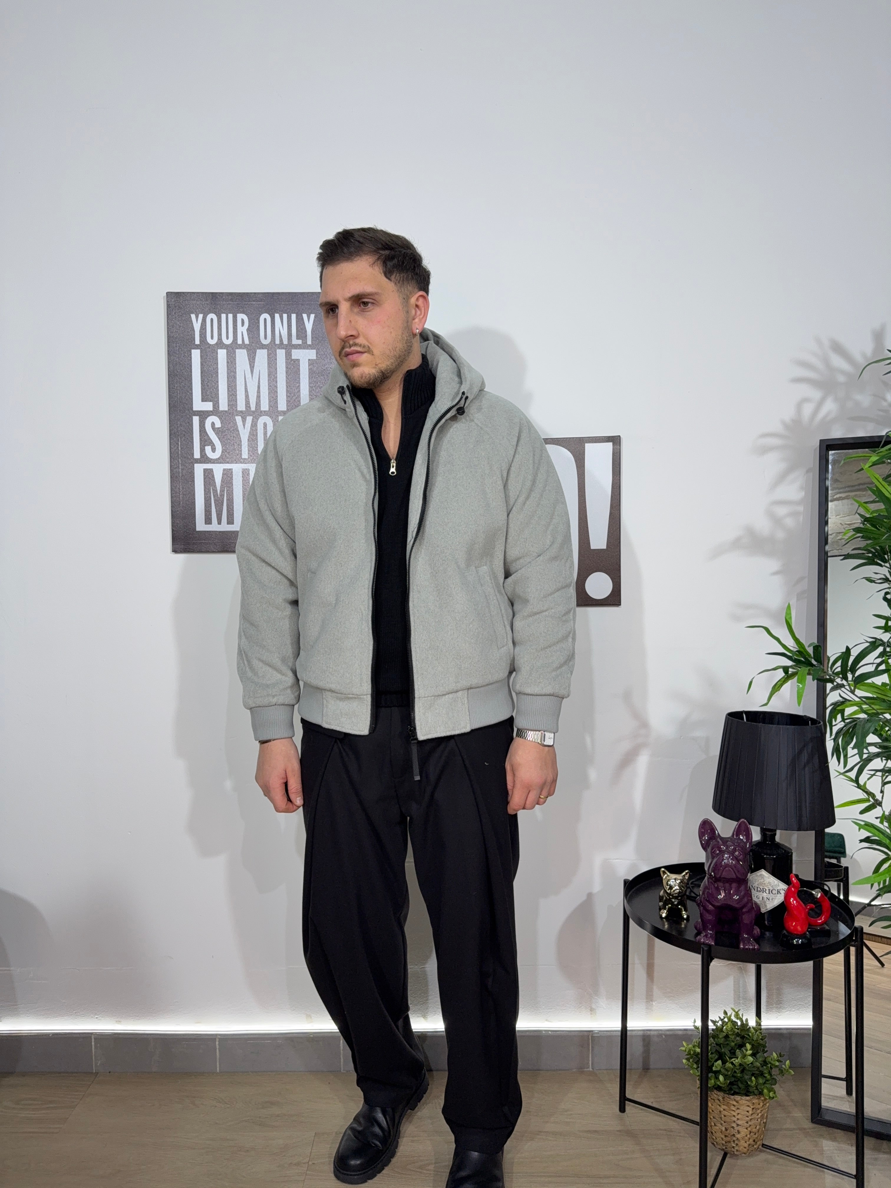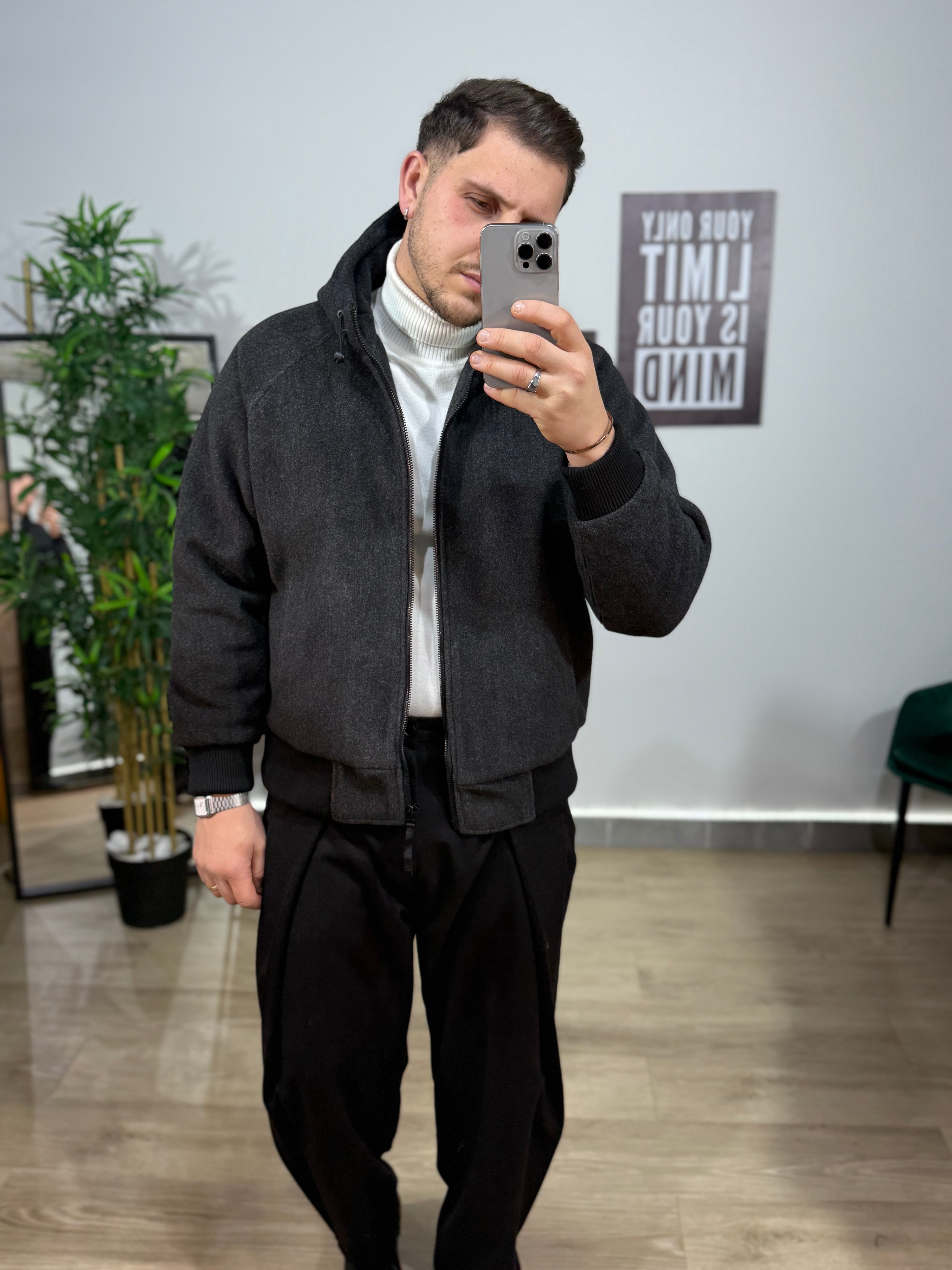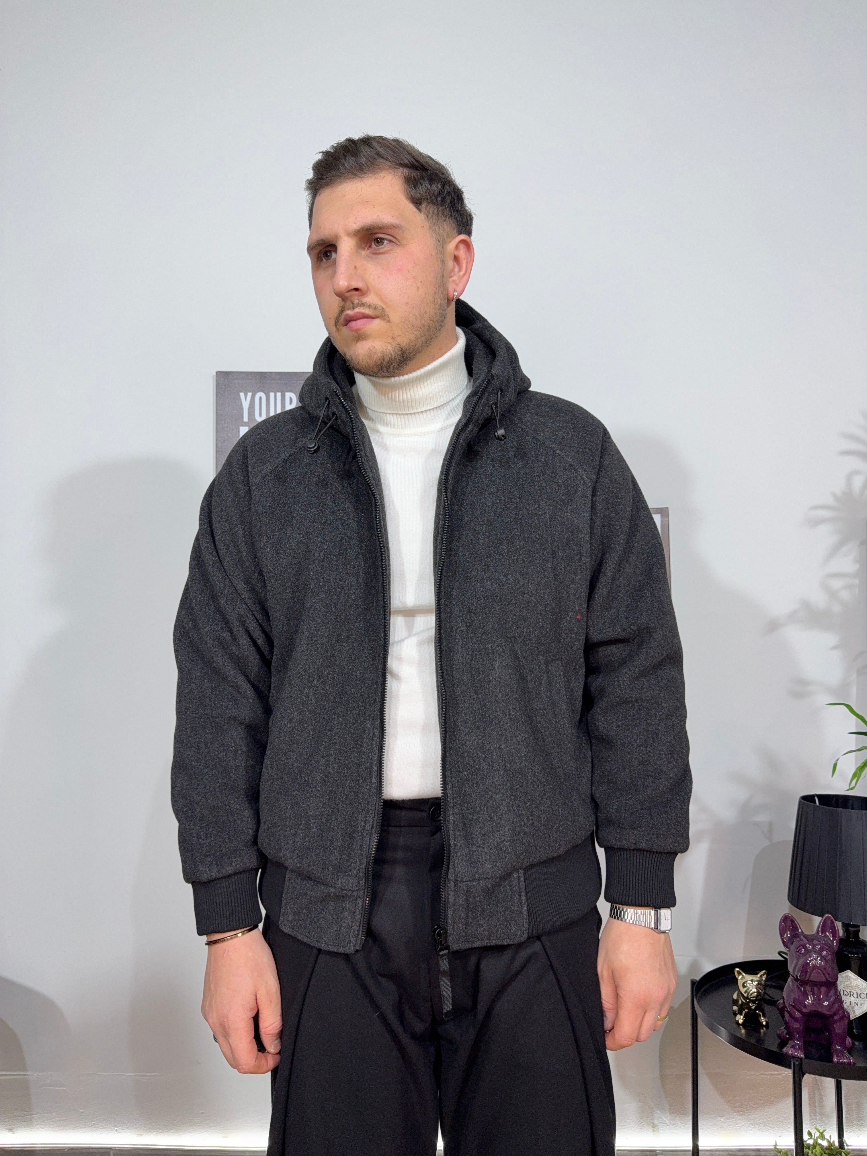 Giubbotto tessuto in panno , imbottito , con cappuccio e coulisse , elastico in vita effetto bomber