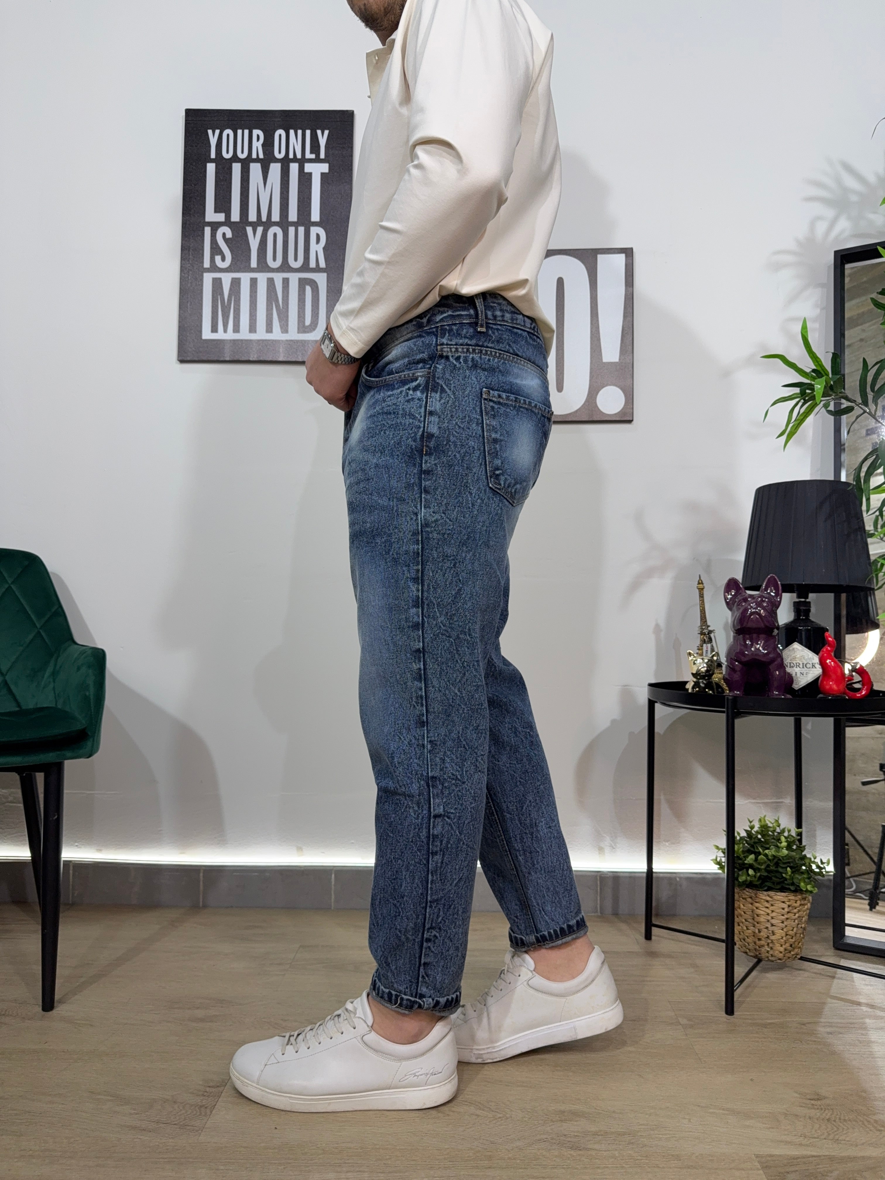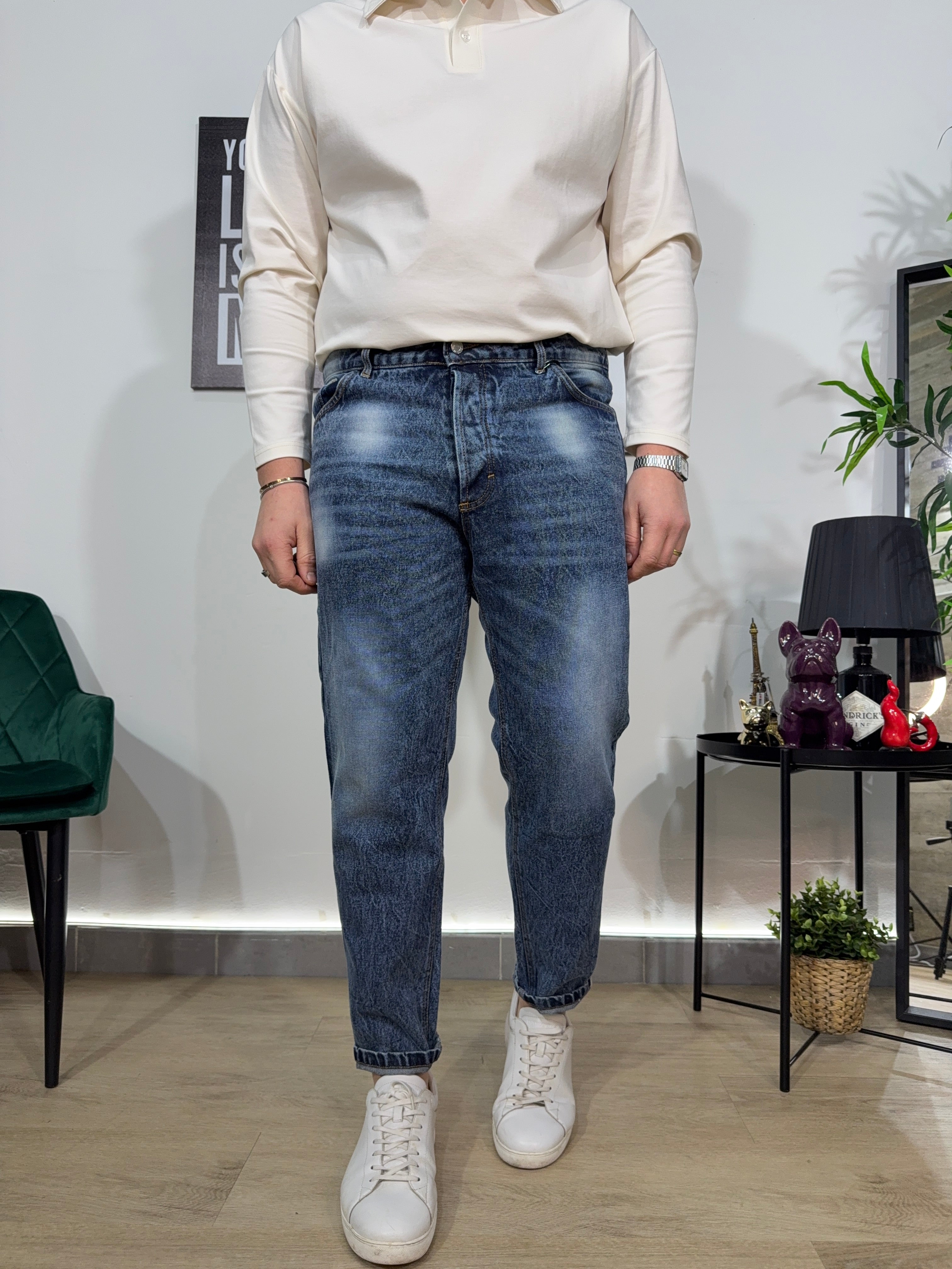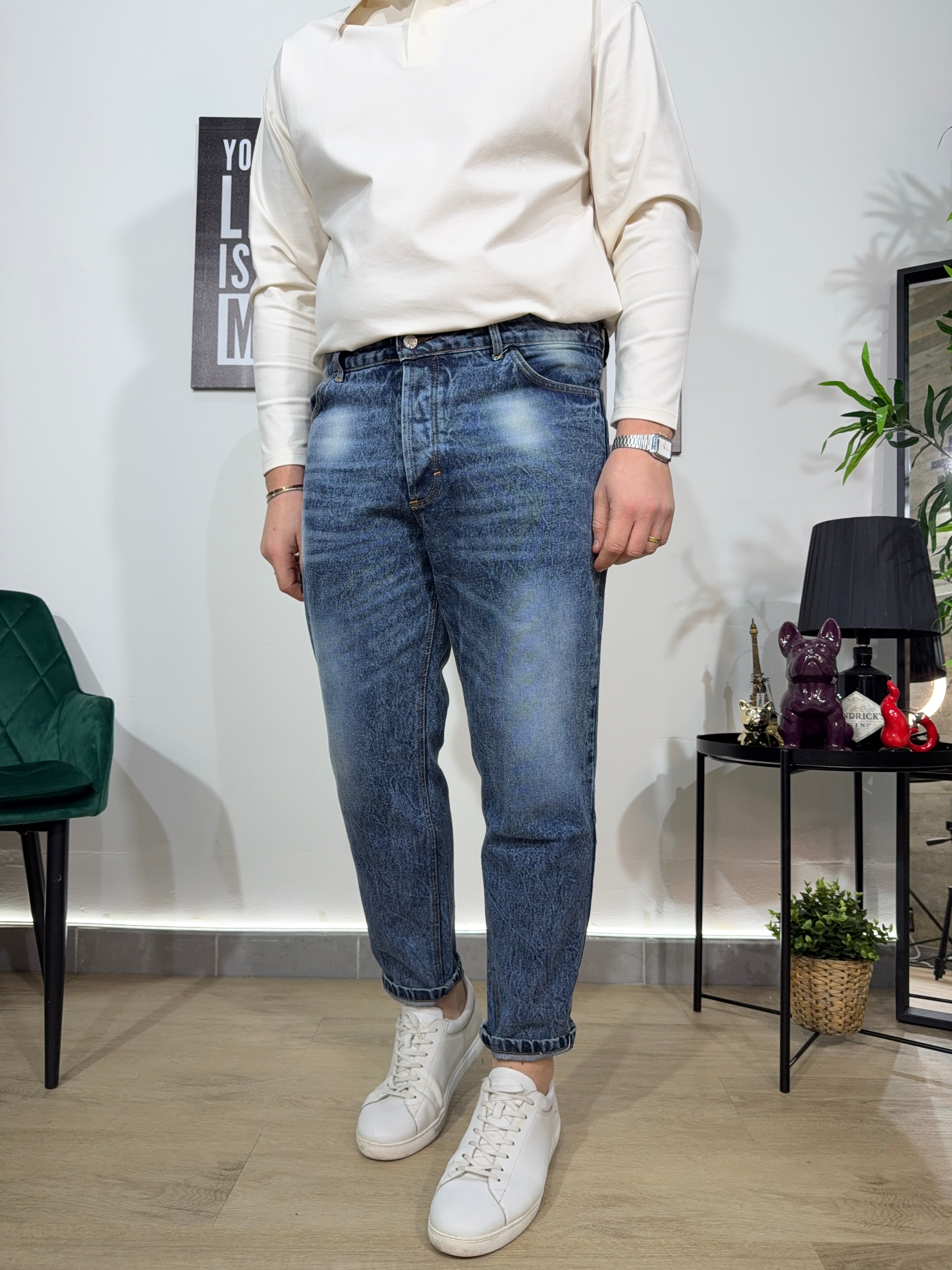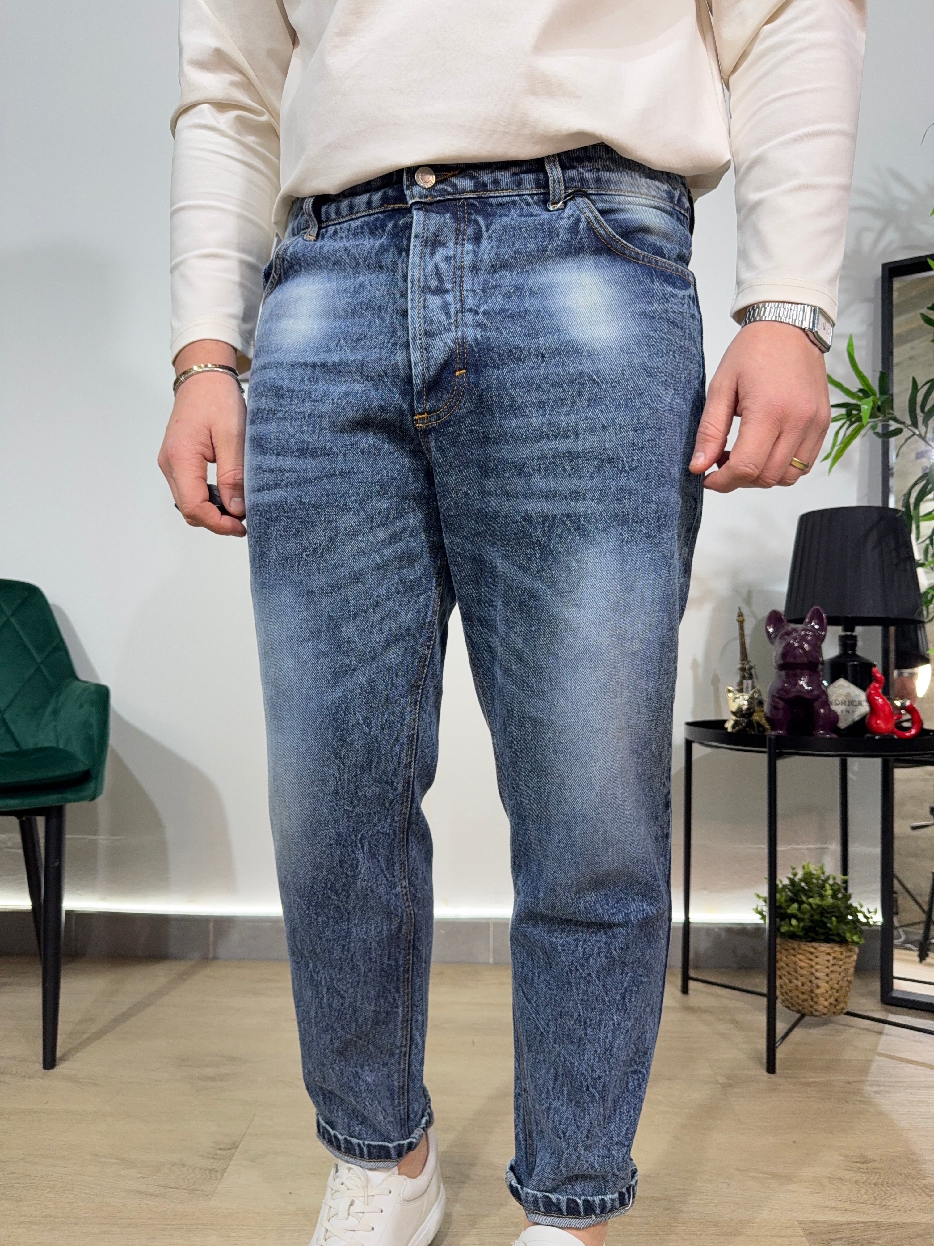 Jeans modello carrot , lavaggio chiaro con sfumature a contrasto