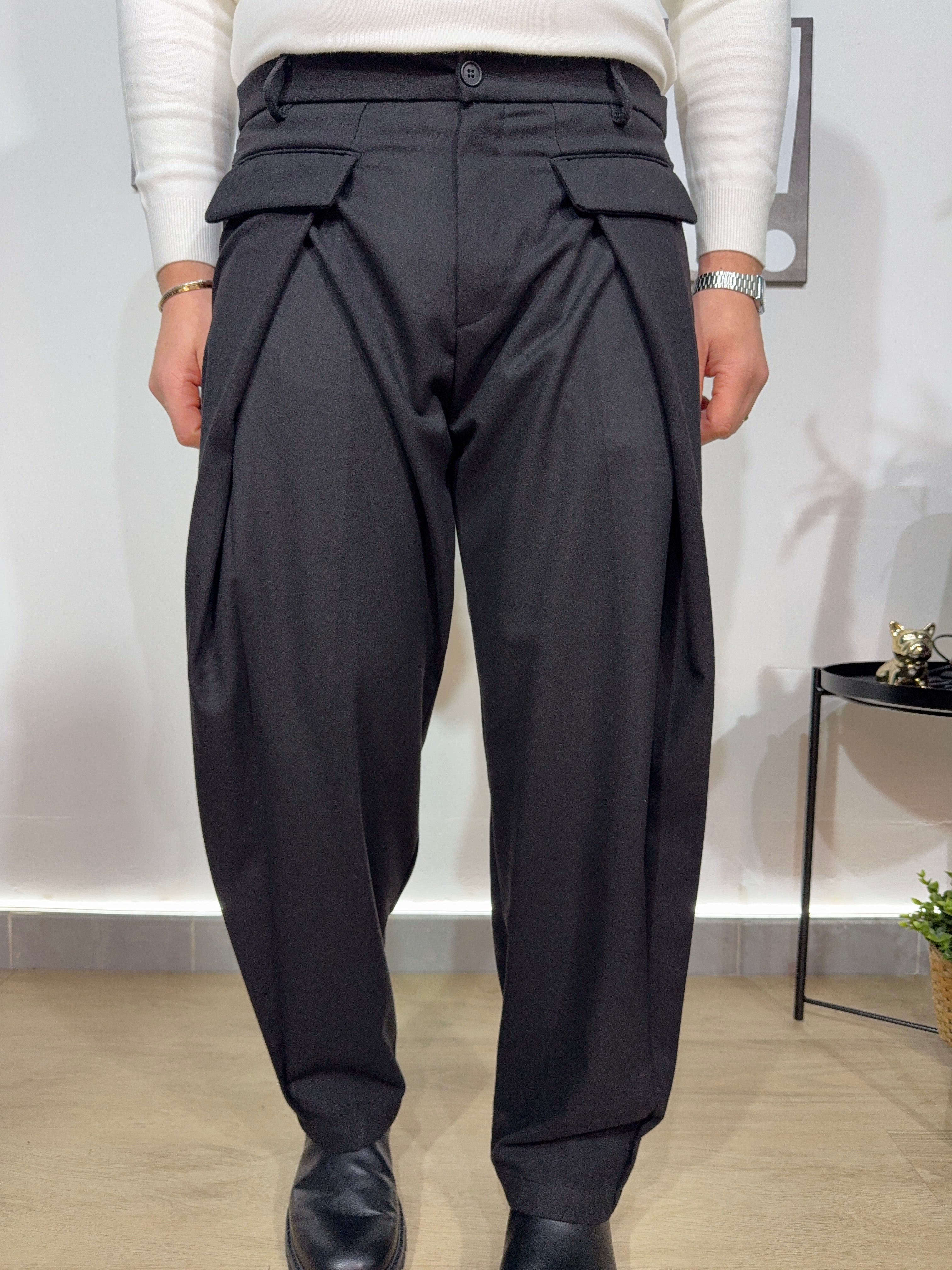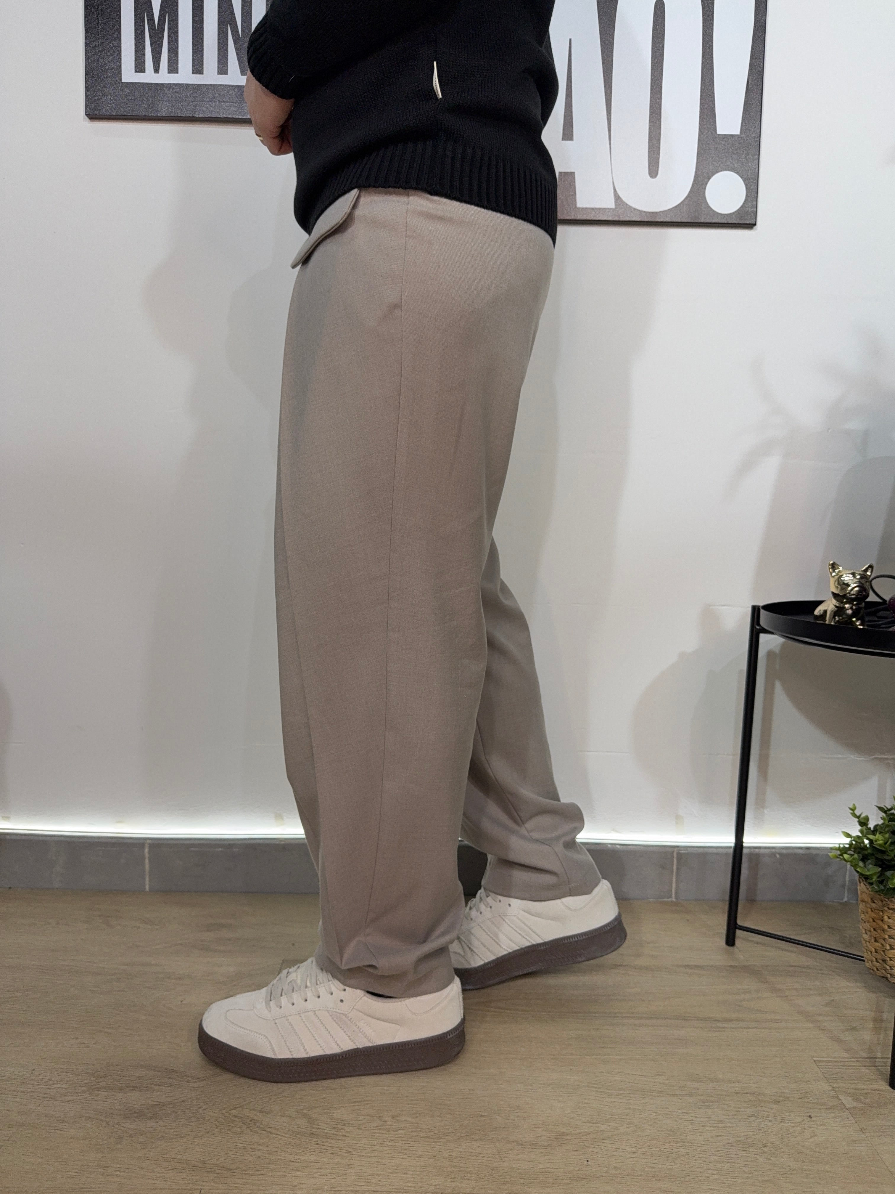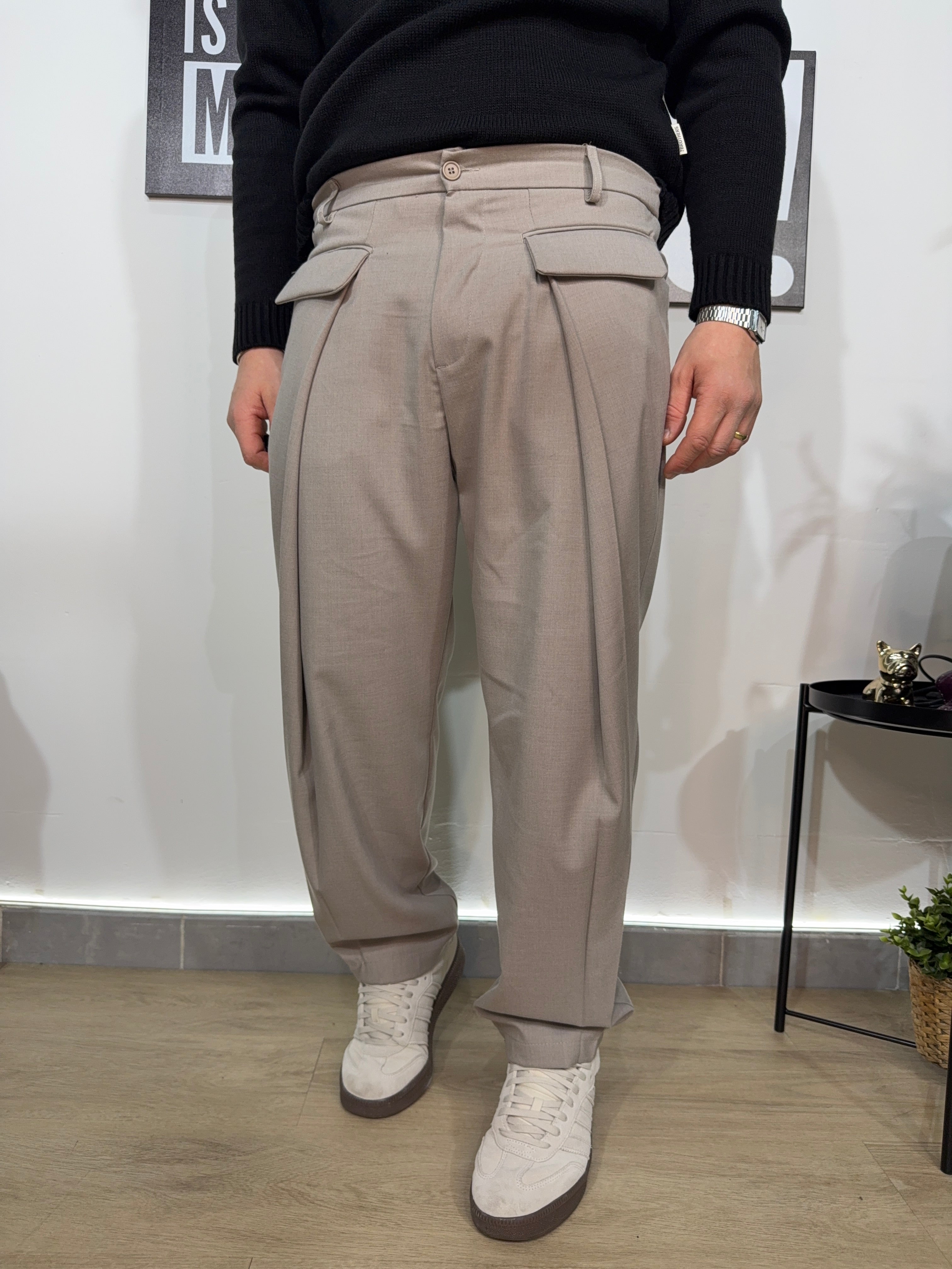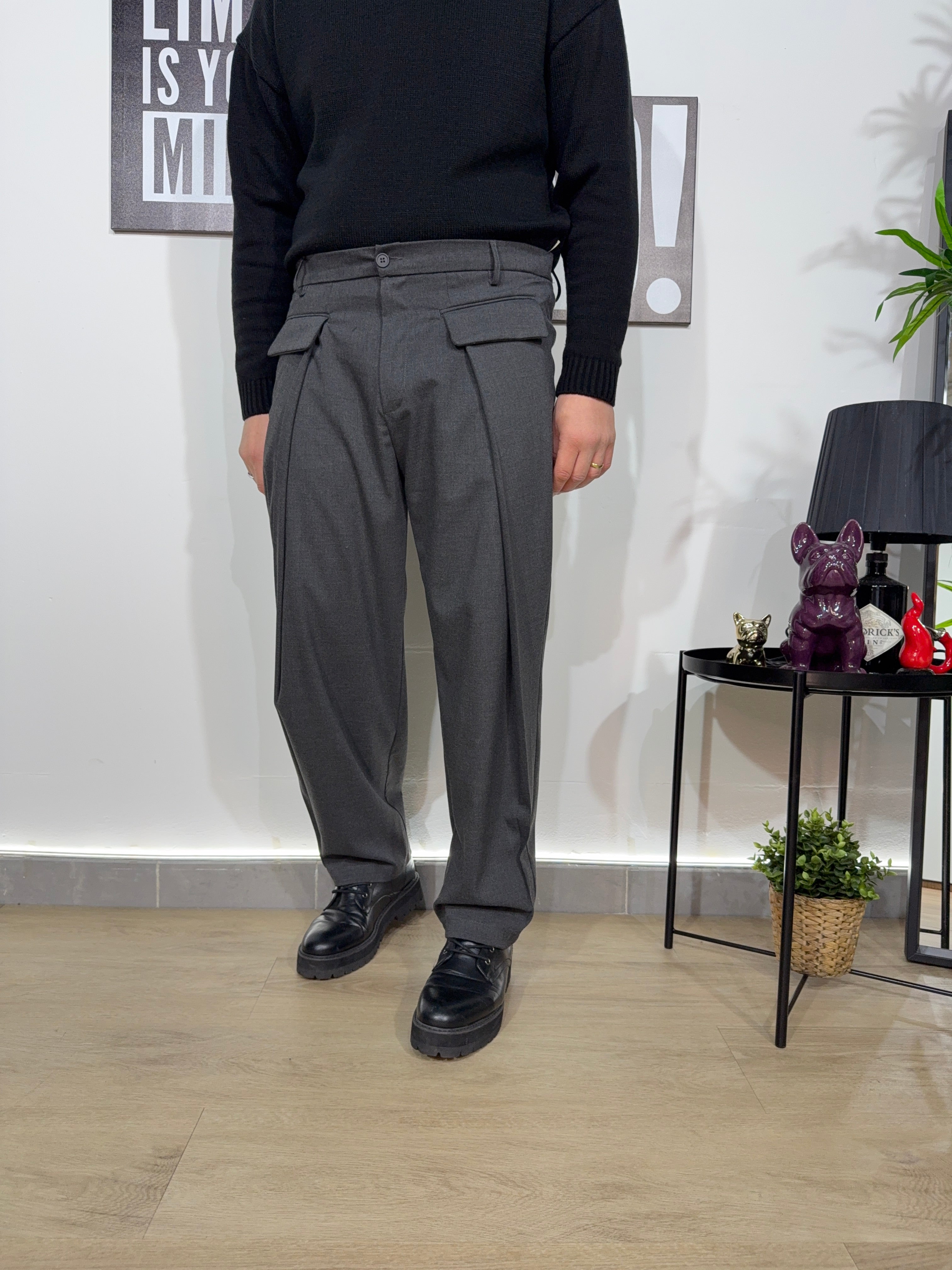Pantalone con pence baciata , fondo ampio regolare , tasche a toppa doppio friso avanti e uno dietro tessuto franella