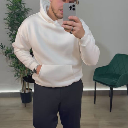 Felpa con cappuccio, tascone sul davanti, felpata all'interno.