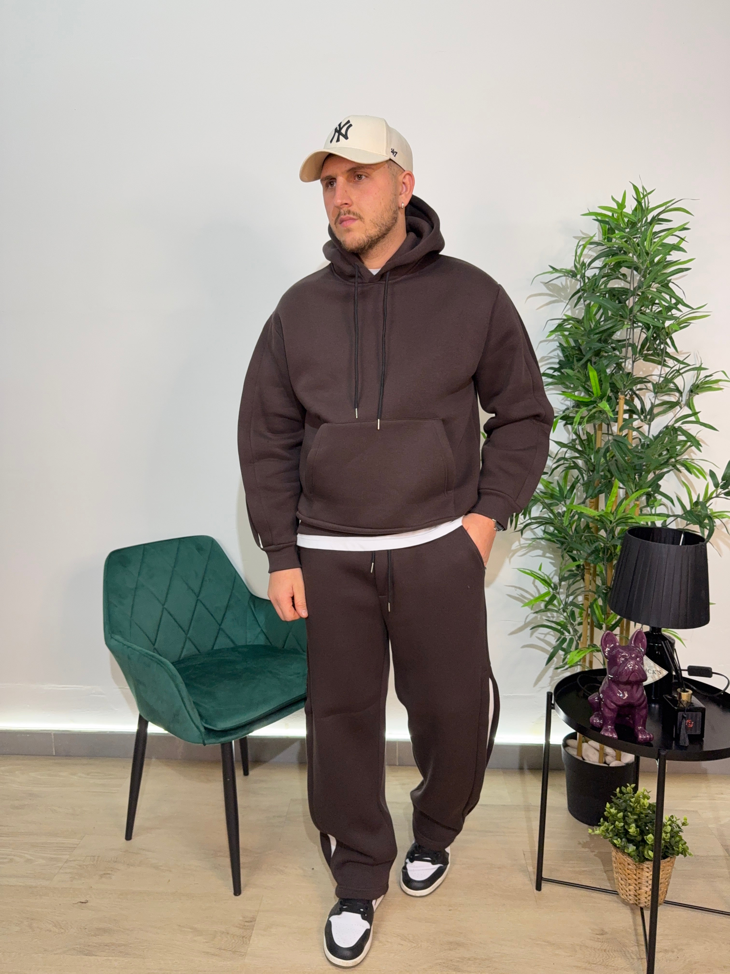 Tuta felpata all'interno, con profilo a contrasto laterale. Pantalone fondo ampio, felpa con cappuccio e tasconi
